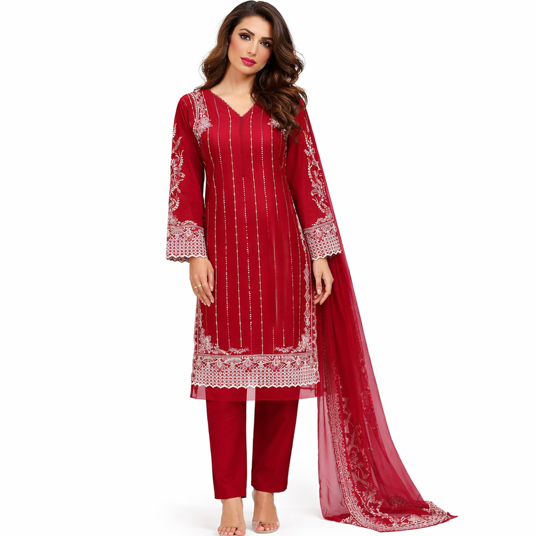 traditional South Asian three-piece suit (kameez, trousers, and dupatta)
