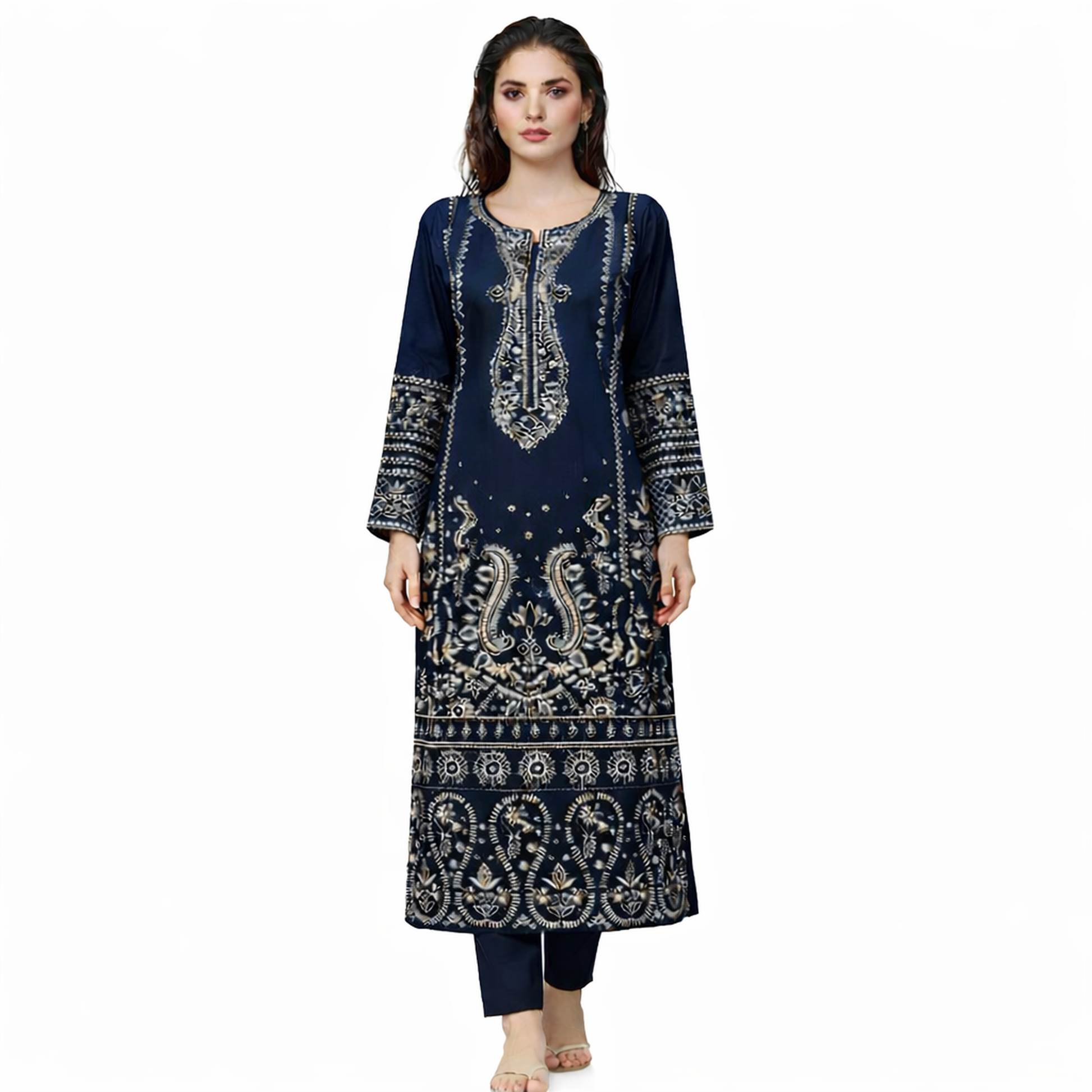 • Cultural or traditional function Neckline: Rounded neckline with a slit opening, heavily embellished with intricate embroidery